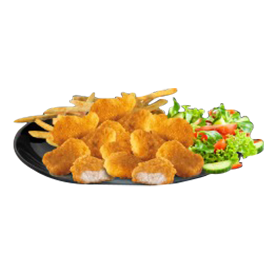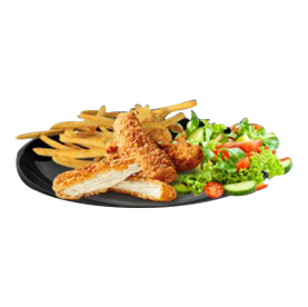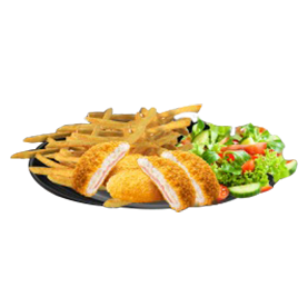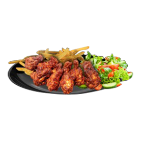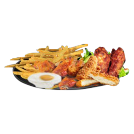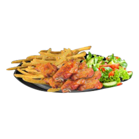 2 Wings, 2 tenders, poulet curry, oeuf, crudités, frites, 1 sauce au choix.
