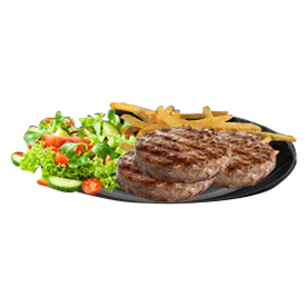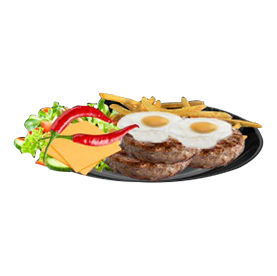3 Steaks hachés, 2 oeufs, 2 cheddars, poivrons, crudités, frites, 1 sauce au choix.